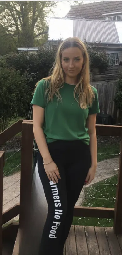 Sleek black leggings with “No Farmers, No Food” printed down the right leg. A clear message with every step.
